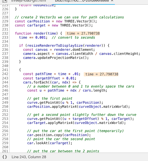 That's pretty huge. If your question is only about the path following part you can remove most of the HTML as you only need a <canvas> and a <script> tag for THREE.js. You can remove the CSS and the resizing code. You can remove .GLTF code because you only care about the path. You can remove the lights and the shadows by using a MeshBasicMaterial. You can certainly remove the lil-gui code. The code makes a ground plane with a texture. It would be easier to use a GridHelper. Finally if our question is about moving things on a path we could just use cubes on the path instead of loaded car models.