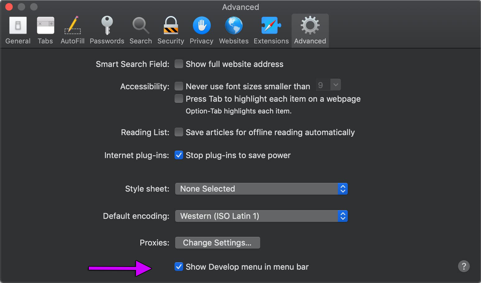 In Safari you first have to enable the Develop menu from the Advanced Safari Preferences.