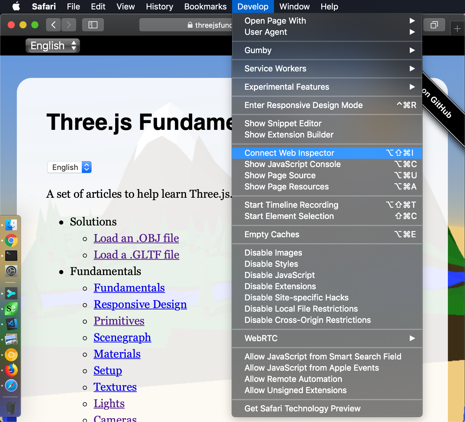 Then in the Develop menu you can pick "Show/Connect Web Inspector".