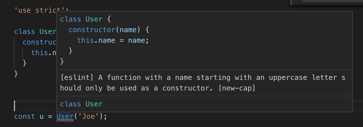 Above you can see eslint knows the rule that UpperCaseNames are constructors